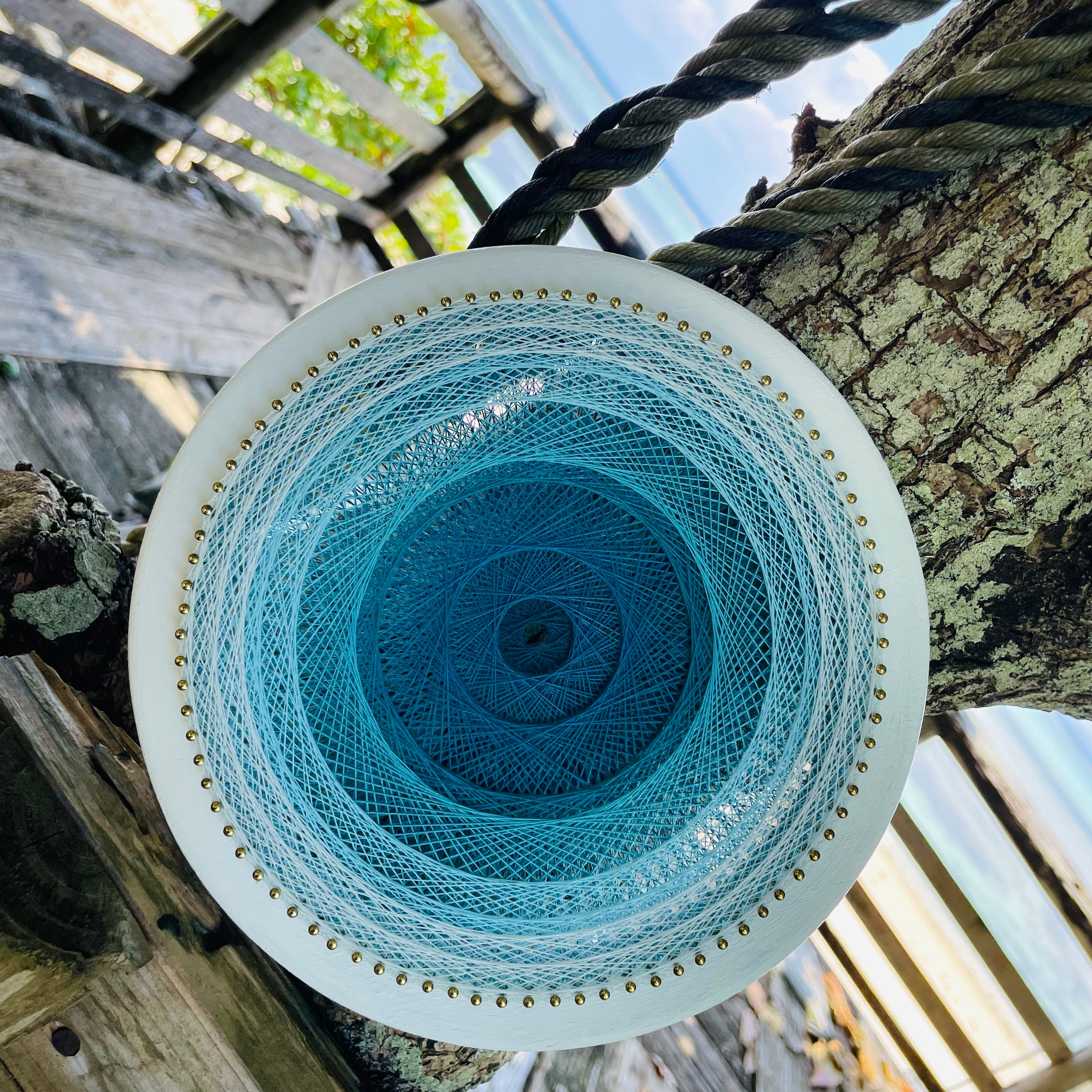 こちらの作品は、沖縄の美しい海の波模様をドーナツ型の板枠に糸と釘を使って表現された今までにない新しいアート作品となっています。