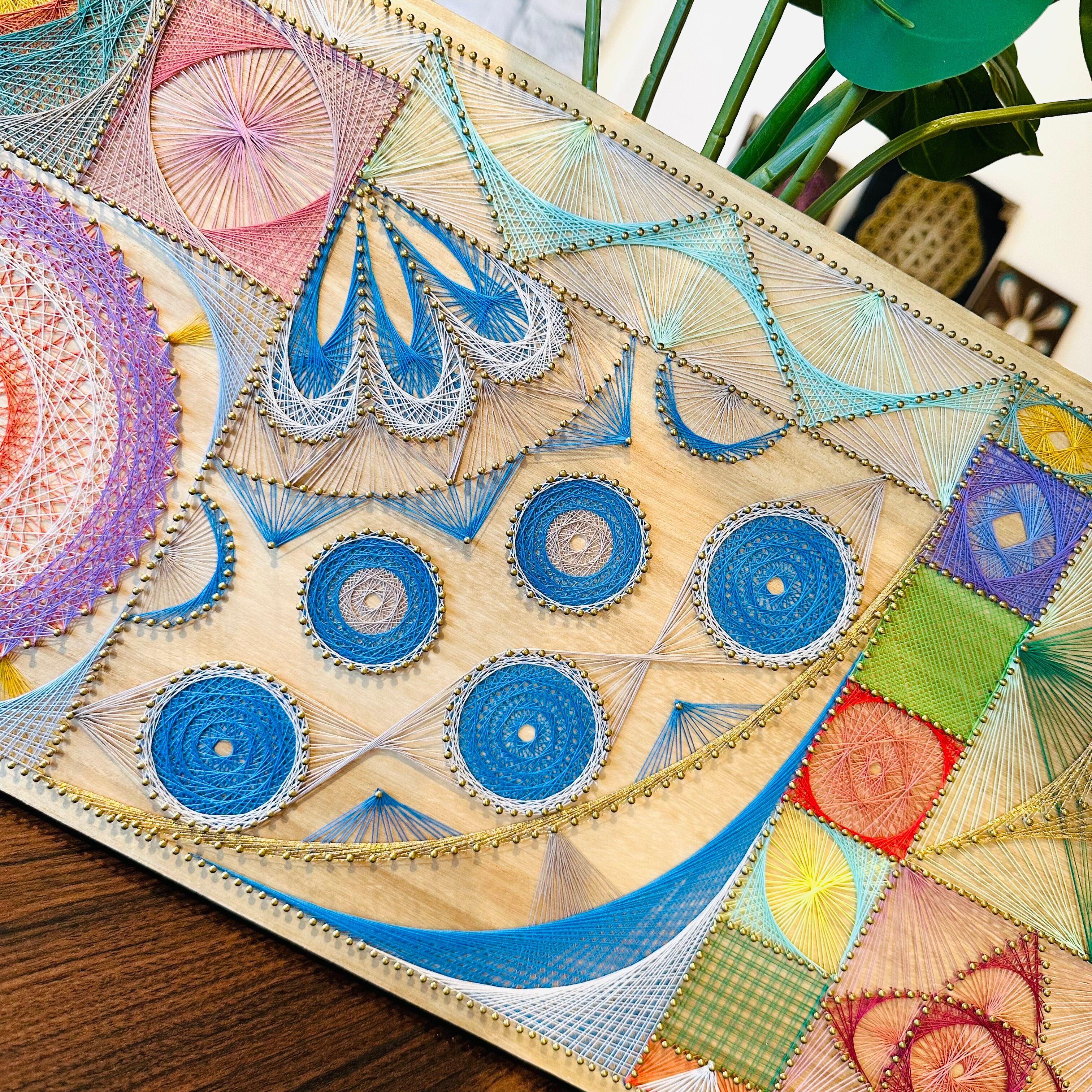 こちらの作品は、Sahさんが創る糸かけアートの中でも人気の高いモチーフを集めて、一枚の木製の板に糸と釘を使って表現された、今までにない新しいアート作品となっています。