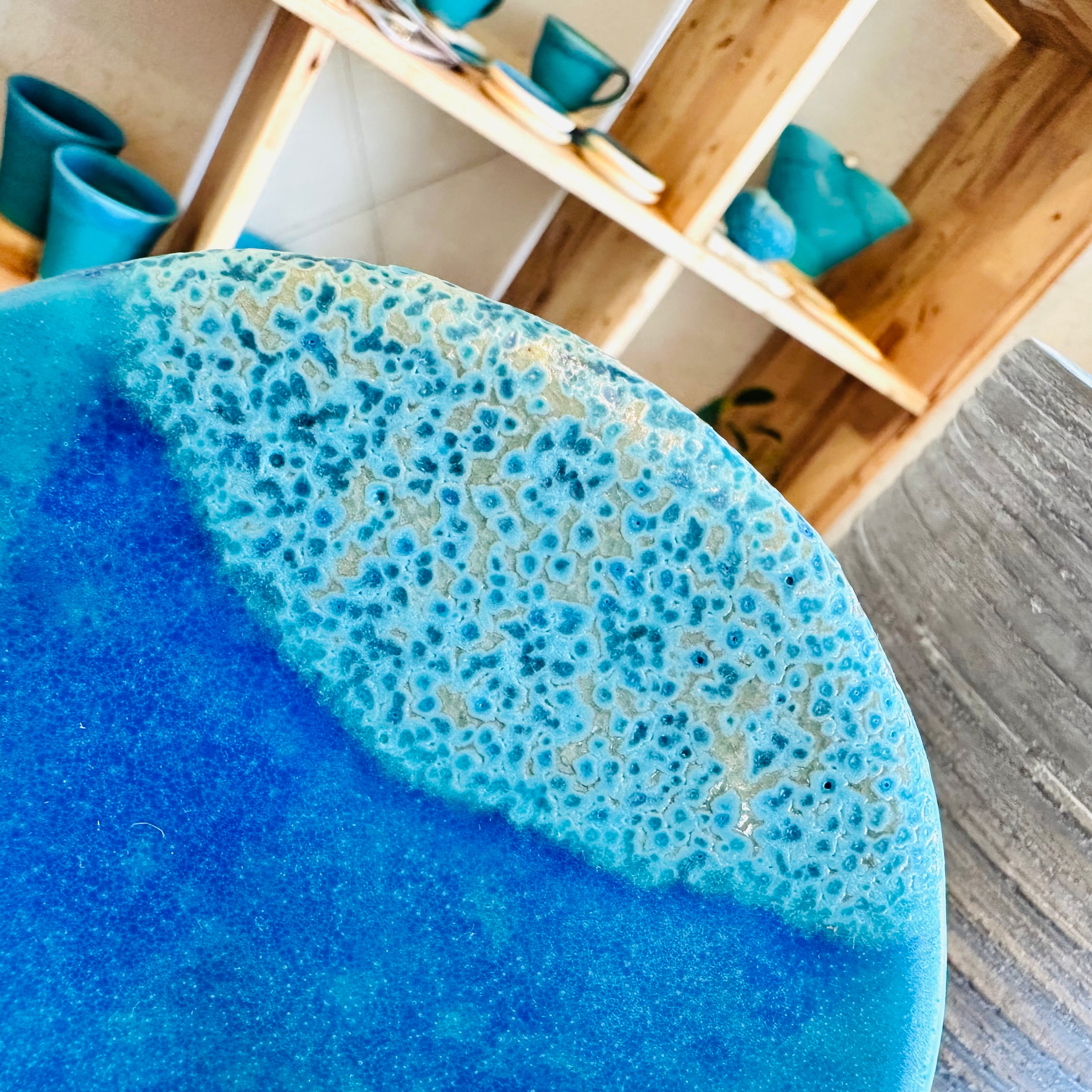 沖縄県うるま市にて、沖縄の海をテーマにしたデザインで沖縄伝統工芸品の「やちむん」に、琉球ガラスや爽快なブルーを取り入れ注目を集めている陶芸家・佐陶慎児氏が創り出す「うるま陶器」、別名「うるまブルーのプレート」の登場です。
