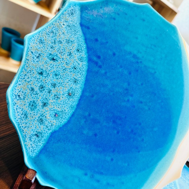 沖縄県うるま市にて、沖縄の海をテーマにしたデザインで沖縄伝統工芸品の「やちむん」に、琉球ガラスや爽快なブルーを取り入れ注目を集めている陶芸家・佐陶慎児氏が創り出す「うるま陶器」、別名「うるまブルーのSpecialなプレート皿」の登場です。