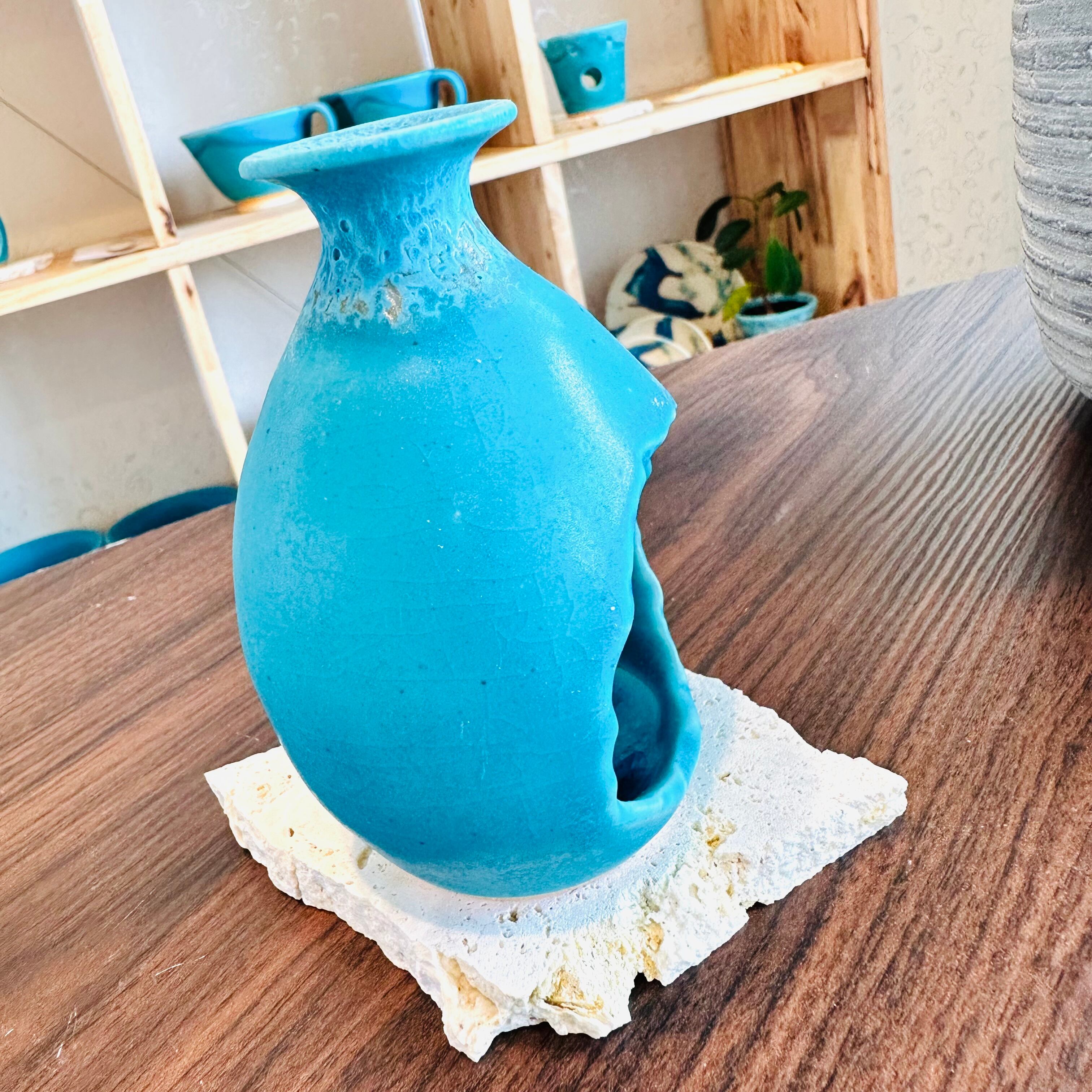 沖縄県うるま市にて、沖縄の海をテーマにしたデザインで沖縄伝統工芸品の「やちむん」に、琉球ガラスや爽快なブルーを取り入れ注目を集めている陶芸家・佐陶慎児氏が創り出す「うるま陶器」、別名「うるまブルーのアロマポット」の登場です。