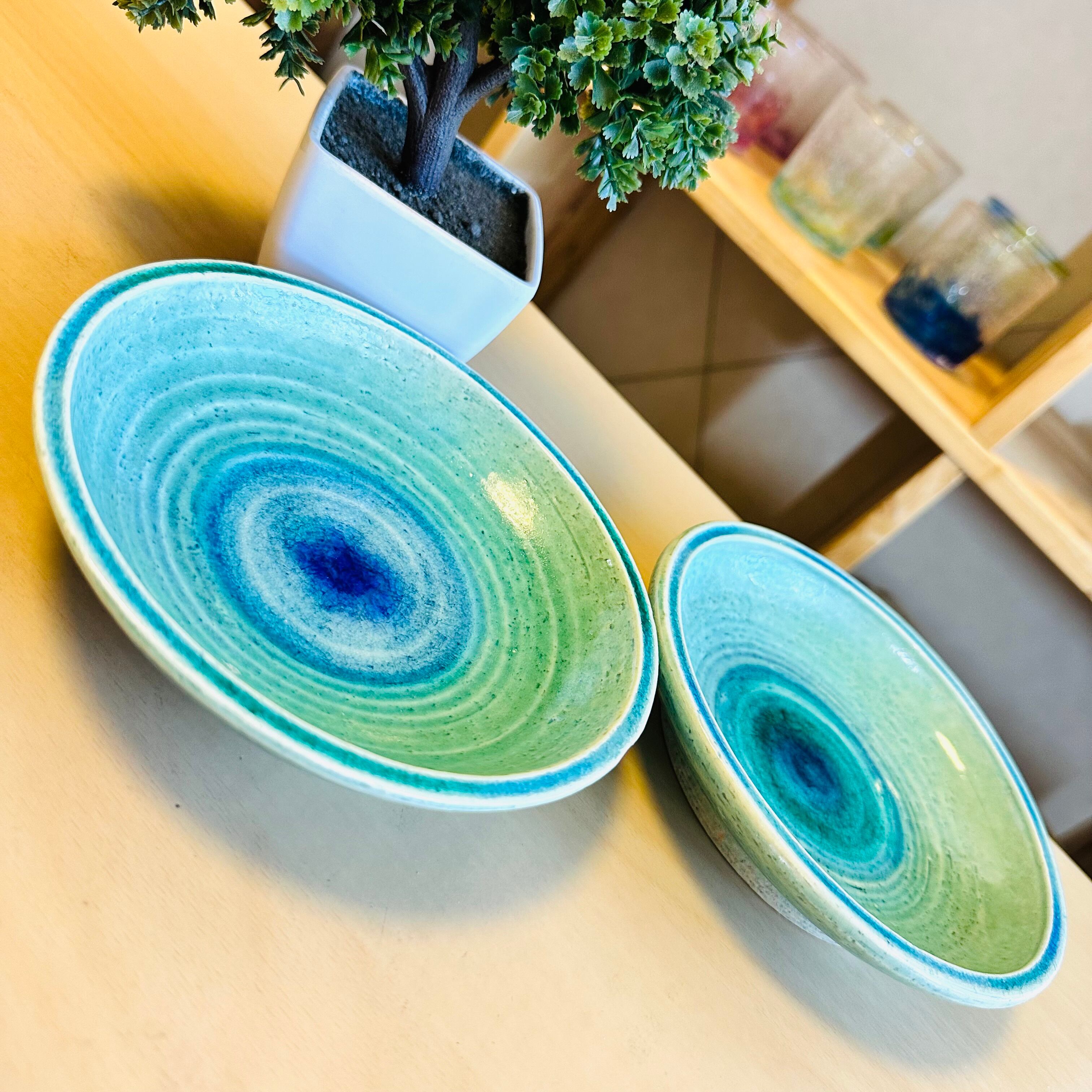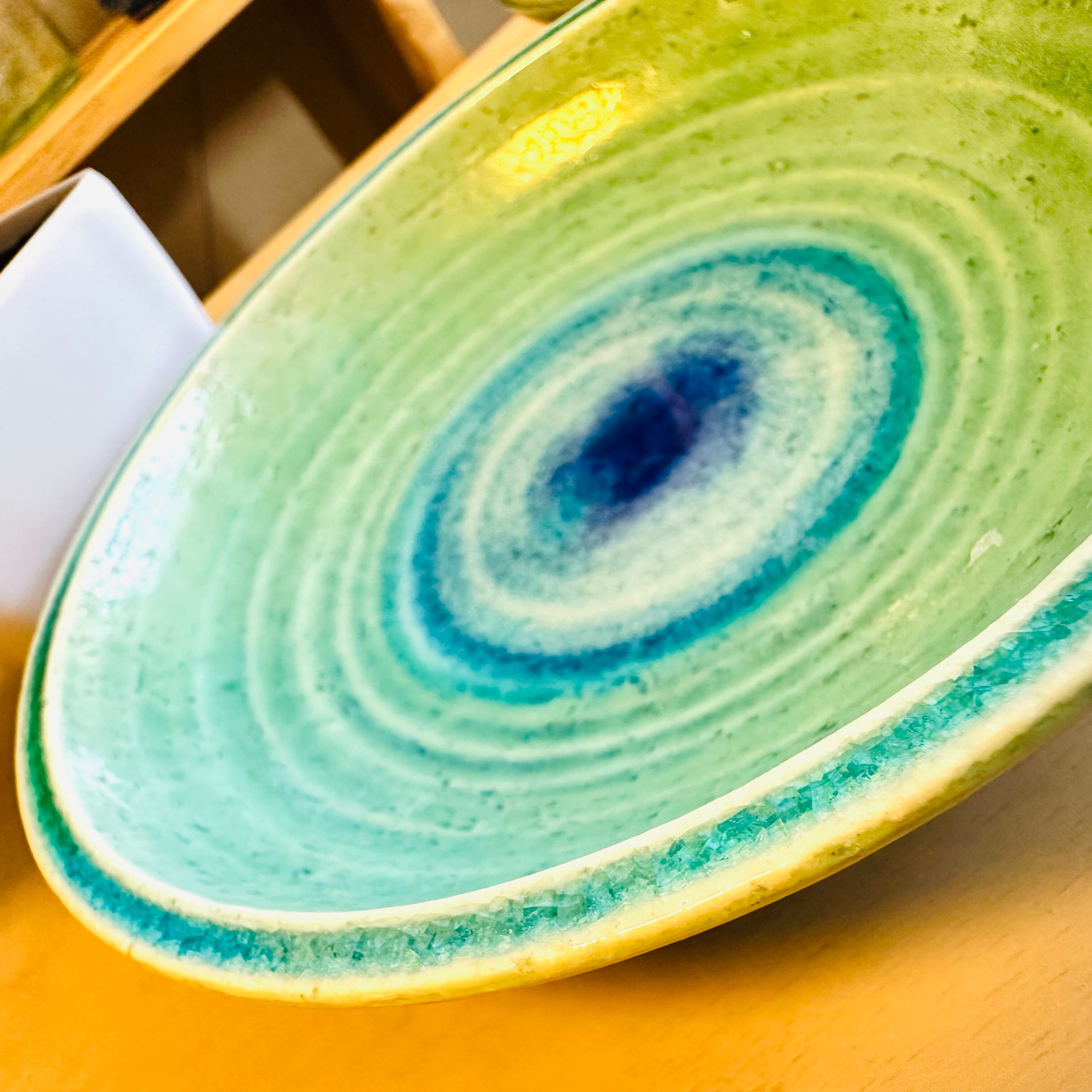 工房にて、陶芸家が一つ一つ手づくりで制作しているため、全てのアイテムに個性があり、2つとして同じものはできない、大量生産も通販も行われていない、あなただけの「ガラス彩陶器」、あなただけの新しい沖縄をB-Blueと風の島がお届けします。