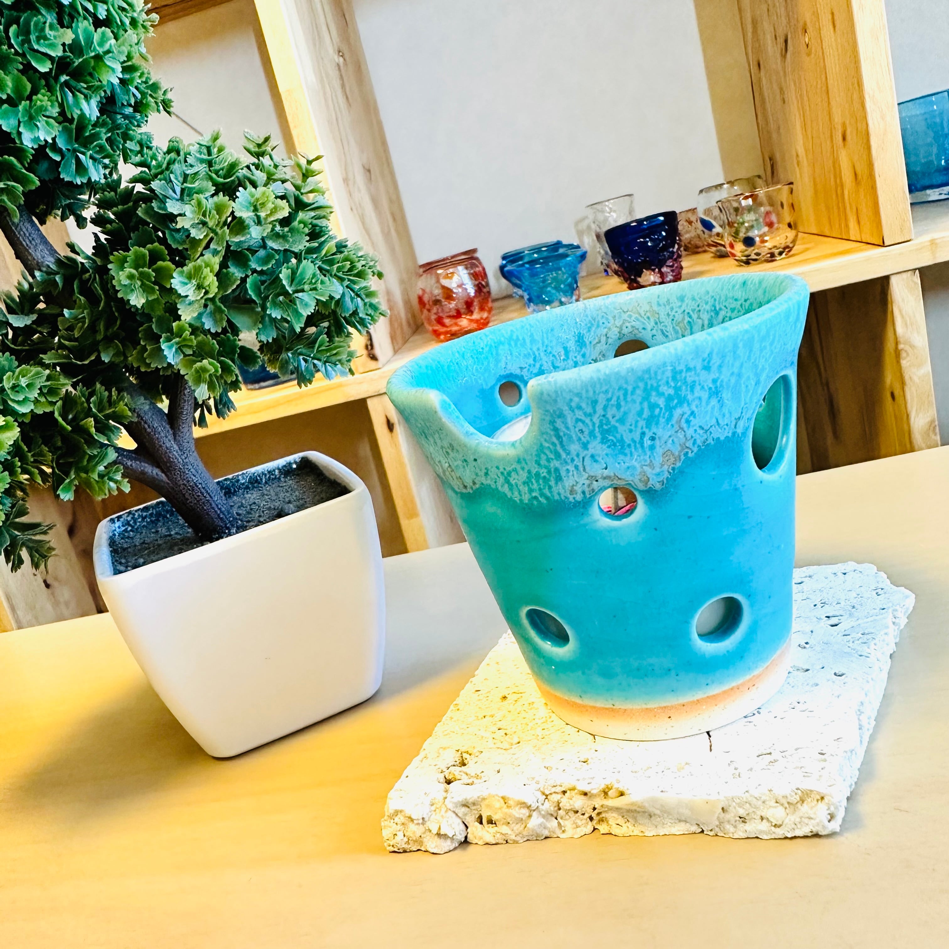 沖縄県うるま市にて、沖縄の海をテーマにしたデザインで沖縄伝統工芸品の「やちむん」に、琉球ガラスや爽快なブルーを取り入れ注目を集めている陶芸家・佐陶慎児氏が創り出す「うるま陶器」、別名「うるまブルーのキャンドルポット」の登場です。