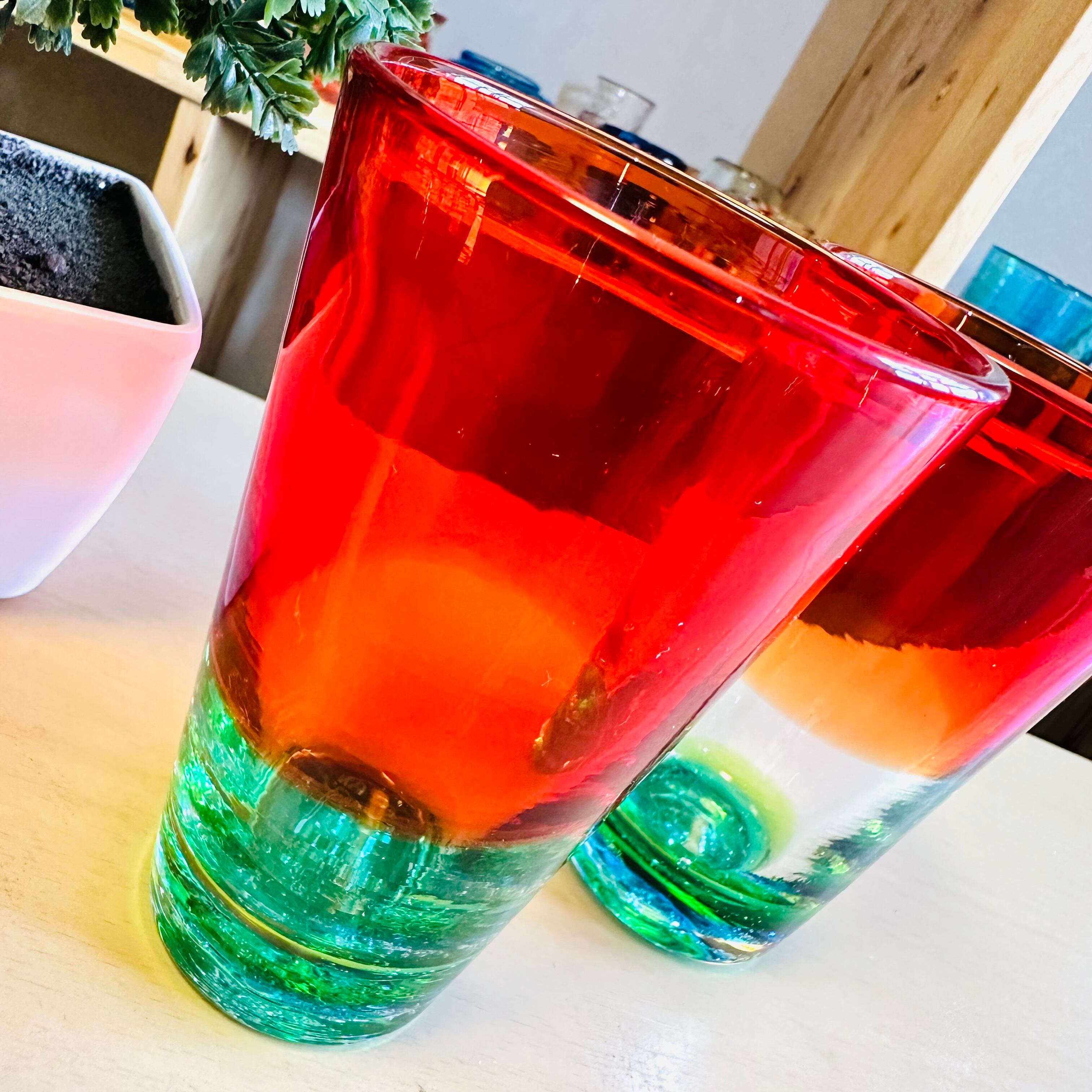 約1000度の熱で真っ赤に溶けたガラスが鉄のパイプから息を吹き込まれることで、様々な色と形へと姿を変えていき、美しいグラスやプレート、器が生まれます。