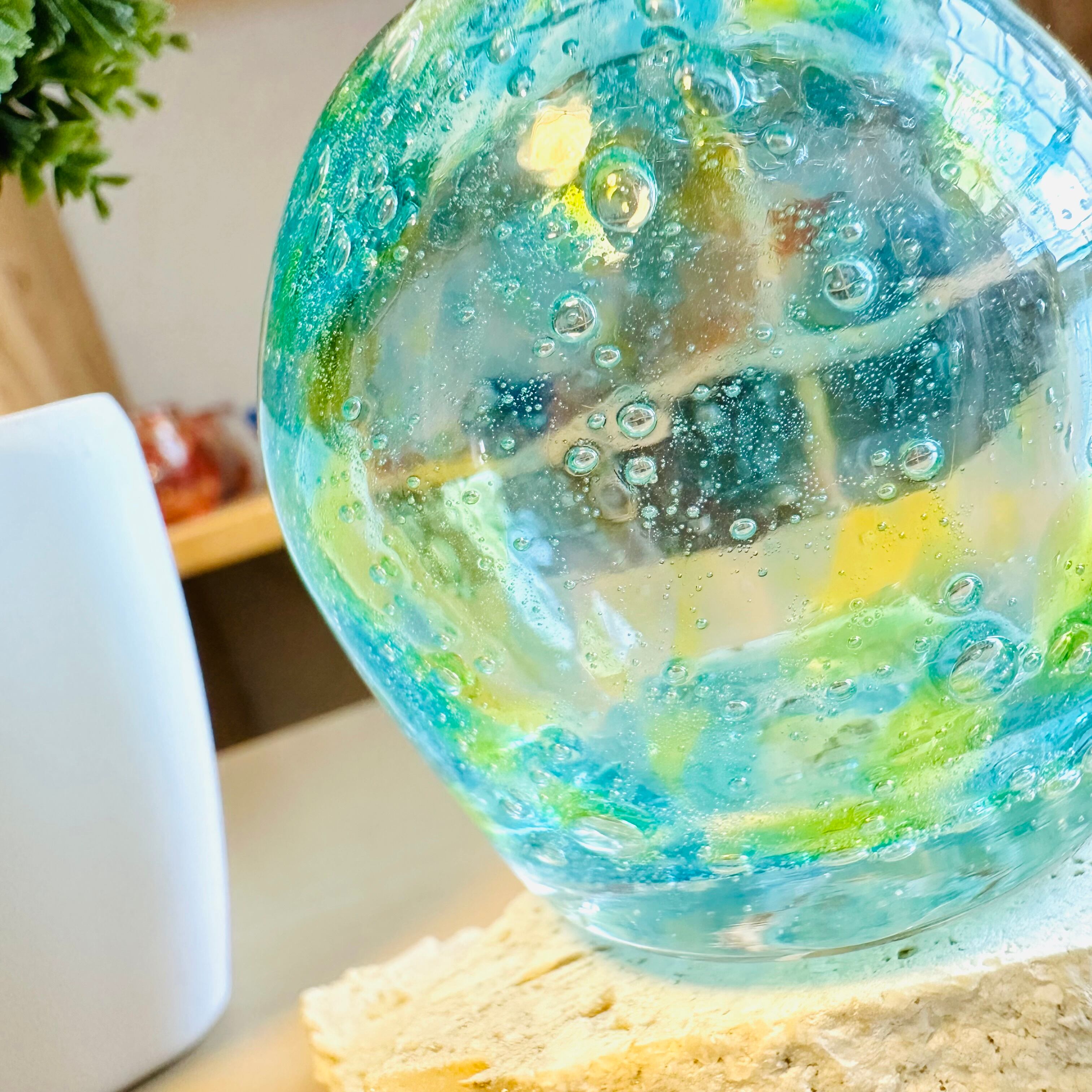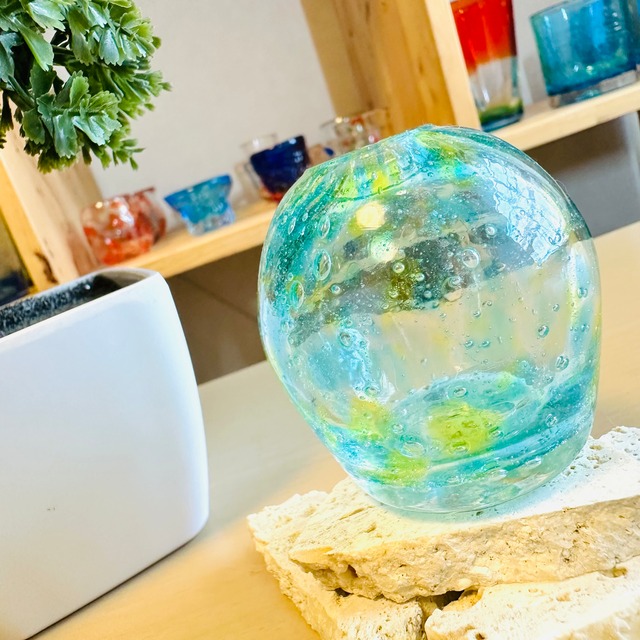 こちらの作品の魅力は、やはり太陽の光を浴びキラキラと輝くを沖縄の海を連想させる美しいガラスのグラデーションではないでしょうか。